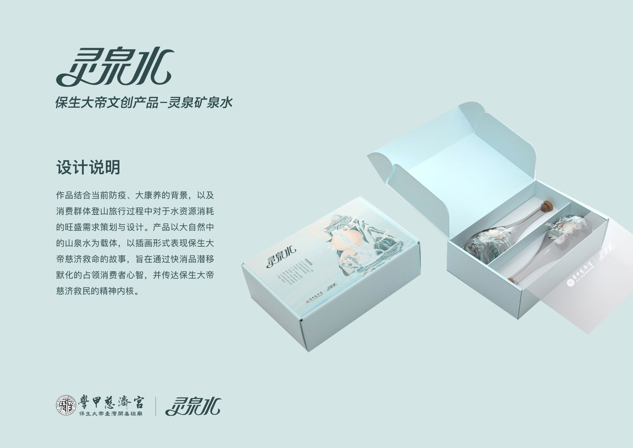 作品结合当前防疫、大康养的背景,以及消费群体登山旅行过程中对于水资源消耗的旺盛需求策划与设计。产品以大自然中的山泉水为载体,以插画形式表现保生大帝慈济救命的故事,旨在通过快消品潜移默化的占领消费者心智,并传达保生大帝慈济救民的精神内核。